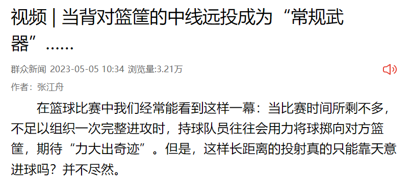 在篮球比赛中我们经常能看到这样一幕:当比赛时间所剩不多,不足以组织一次完整进攻时,持球队员往往会用力将球掷向对方篮筐,期待“力大出奇迹”。但是,这样长距离的投射真的只能靠天意进球吗?并不尽然。