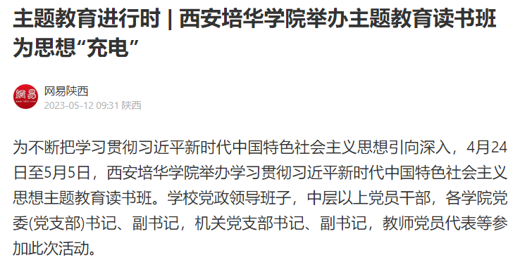 5月5日,读书班顺利结业。罗新远书记分享学习心得,他强调,深入开展学习贯彻习近平新时代中国特色社会主义思想主题教育是一项重要的政治任务,各级领导干部要切实运用好读书班学习成果,让学习贯彻习近平新时代中国特色社会主义思想成为行动自觉,更要把习近平新时代中国特色社会主义思想作为调查研究的理论遵循,尤其在当前要结合实际,研究探讨如何打造高质量发展的百年培华问题、如何做到创新发展问题、如何服务社会问题。