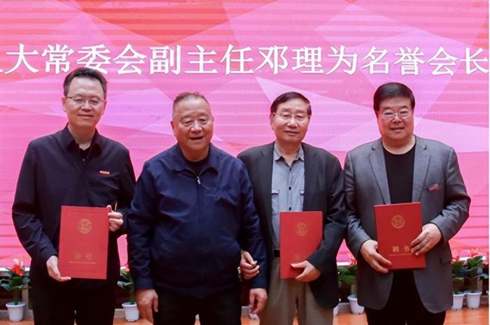 陕西省十届人大常委会副主任邓理为陕西省新闻摄影学会名誉会长梁平(右二)、姜波(左一)、杜耀峰(右一)、王天育(因故未到场)颁发聘书并对学会未来发展表示祝福。