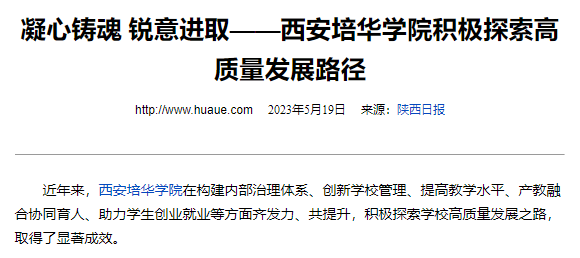 近年来,西安培华学院在构建内部治理体系、创新学校管理、提高教学水平、产教融合协同育人、助力学生创业就业等方面齐发力、共提升,积极探索学校高质量发展之路,取得了显著成效。