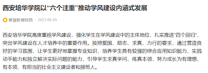 西安培华学院高度重视学风建设,强化学生在学风建设中的主体地位,扎实推进“四个回归”,突出学风建设在人才培养中的重要作用。按照爱国、励志、求真、力行的要求,通过营造良好的学习氛围,让学生更好地掌握专业知识,培养学生具有较强的综合应用知识能力、实践动手能力和独立解决实际问题的能力,引导学生求真学问、练真本领,努力成长为有理想、有本领、有担当的社会主义建设者和接班人。