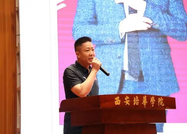 西安培华学院理事长姜波致辞,理事长对高等教育提出高质量任务,以学生需求和市场需求为导向,在互联网滋生下人才培养出现新的起点。同时,希望各企业为我校学生给予更多创业支持和教育指导,释放合作资源,构建更全面的师资队伍。