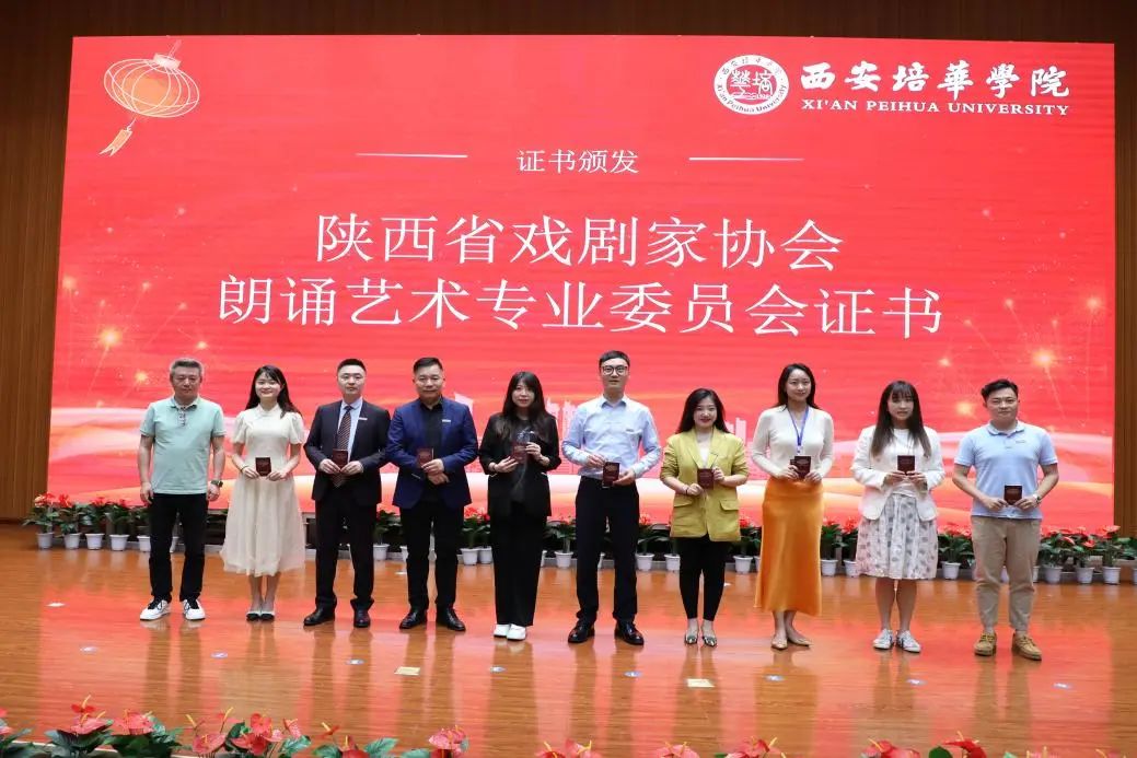 陕西铭晟话剧艺术团有限公司总经理张晨为播音与主持艺术专业教师颁发陕西省戏剧家协会朗诵艺术专业委员会证书。