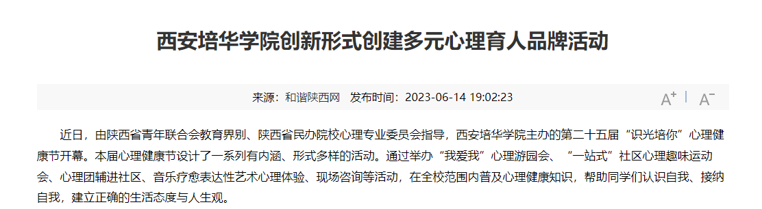 近期,由陕西省青年联合会教育界别、陕西省民办院校心理专业委员会指导,西安培华学院主办的第二十五届“识光培你”心理健康节成功举办。本届心理健康节设计了一系列有内涵、形式多样的活动。通过举办“我爱我”心理游园会、“一站式”社区心理趣味运动会、心理团辅进社区、音乐疗愈表达性艺术心理体验、现场咨询等活动,在全校范围内普及心理健康知识,帮助同学们认识自我、接纳自我,建立正确的生活态度与人生观。