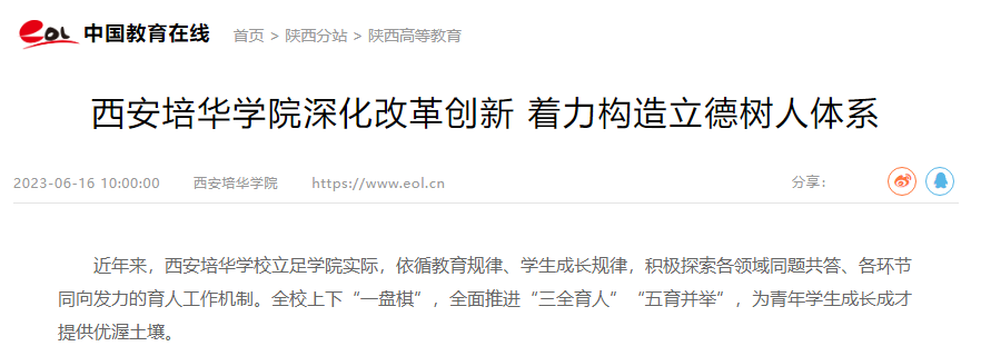 近年来,西安培华学院立足学院实际,依循教育规律、学生成长规律,积极探索各领域同题共答、各环节同向发力的育人工作机制。全校上下“一盘棋”,全面推进“三全育人”“五育并举”,为青年学生成长成才提供优渥土壤。