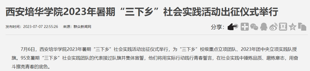 据悉,本次暑期“三下乡”社会实践活动组建了95支校级重点立项团队(含10项团中央立项团队),同时也蕴含着培华青年向培华建校95周年的庄重献礼。重点组织学生围绕理论宣讲、乡村振兴推进、发展成就观察、民族团结实践、绿色生态宣传、创新创业研学等方面,深入农村和基层一线,在亲身经历中,坚定理想信念、了解国情民情社情、练就过硬本领,把青春奉献在党和国家最需要的地方,努力在社会实践的舞台上谱写更新、更美的篇章。