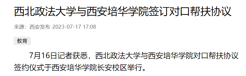 7月16日记者获悉,西北政法大学与西安培华学院对口帮扶协议签约仪式于西安培华学院长安校区举行。