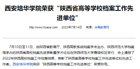 7月10日至11日,由陕西省教育厅、陕西高教系统档案学会主办,陕西师范大学档案馆承办的陕西省高校档案先进表彰暨学术论坛在陕西师范大学雁塔校区举行,会上通报了2022年陕西高校档案工作检查结果,表彰了陕西省高等学校档案工作先进单位和先进工作者。西安培华学院荣获“陕西高等学校档案工作先进单位”荣誉称号。