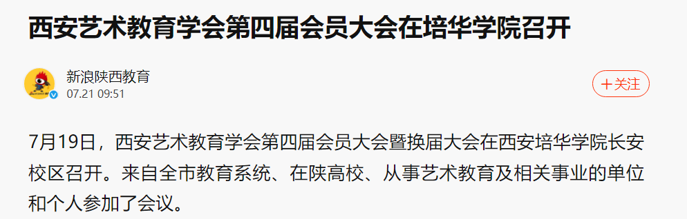 7月19日,西安艺术教育学会第四届会员大会暨换届大会在西安培华学院长安校区召开。来自全市教育系统、在陕高校、从事艺术教育及相关事业的单位和个人参加了会议。