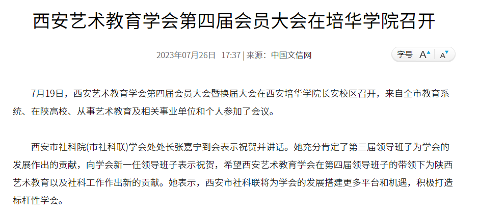 7月19日,西安艺术教育学会第四届会员大会暨换届大会在西安培华学院长安校区召开,来自全市教育系统、在陕高校、从事艺术教育及相关事业单位和个人参加了会议。