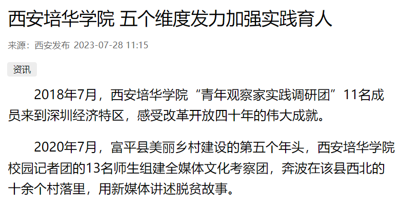 近年来,西安培华学院充分关注大学生的成长成才规律和教育教学活动规律,以服务学生的社会化成长为目标,重点从实践教学、第二课堂、社会实践、社团活动以及志愿服务等五个维度发力,积极构建实践育人体系,淬炼学生的综合素质,促进学生德智体美劳全面发展。