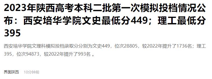 界面陕西获悉,7月30日,陕西省教育考试院官网公布2023年陕西省普通高校招生本科二批录取开始模拟投档信息及情况统计表。据统计表显示,西安培华学院文理科模拟投档录取分分别为文史449,位次28805,较2022年提升了1736名;理工395,位次94873,较2022年提升了993名 。另外,在已经录取结束的16个省市地区中,西安培华学院计划完成率均达100%,录取分超省控线20分以上的省份达到了10个,超省控线10分的省份达到了15个。