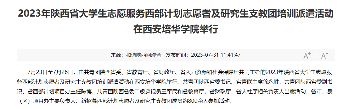 7月23日至7月28日,由共青团陕西省委、省教育厅、省财政厅、省人力资源和社会保障厅共同主办的2023年陕西省大学生志愿服务西部计划志愿者及研究生支教团培训派遣活动在西安培华学院举行。共青团陕西省委书记、省青联主席徐永胜,共青团陕西省委副书记、省西部计划项目办主任陈博,共青团陕西省委二级巡视员王军民和省教育厅、省财政厅、省人社厅相关负责人出席活动,各市、县(区)项目办主要负责人、新招募西部计划志愿者及研究生支教团成员约800余人参加活动。