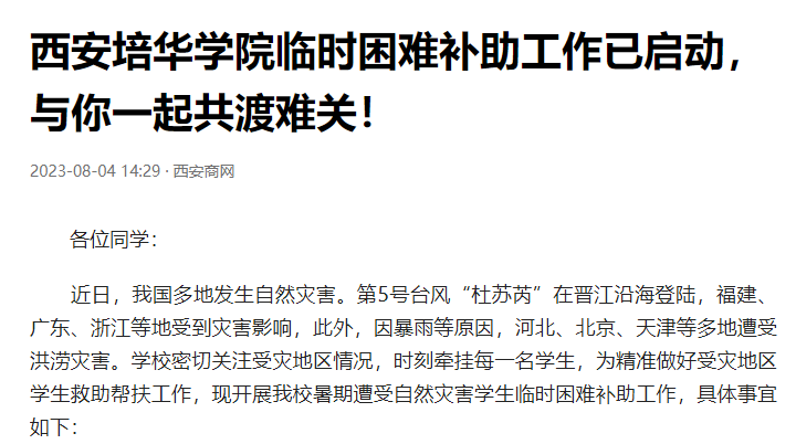 近日,我国多地发生自然灾害。第5号台风“杜苏芮”在晋江沿海登陆,福建、广东、浙江等地受到灾害影响,此外,因暴雨等原因,河北、北京、天津等多地遭受洪涝灾害。学校密切关注受灾地区情况,时刻牵挂每一名学生,为精准做好受灾地区学生救助帮扶工作,现开展我校暑期遭受自然灾害学生临时困难补助工作,具体事宜如下: