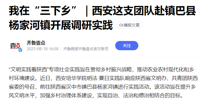 “文明实践看陕西”专项社会实践旨在贯彻乡村振兴战略,推动农业农村现代化和乡村环境建设。近日,西安培华学院明法·夏日实践队响应陕西省文明办、共青团陕西省委的号召,前往陕西省汉中市镇巴县杨家河镇进行实践活动。该活动旨在提升乡风文明水平,加强乡村治理体系建设,实现自治、法治和德治相结合的目标。