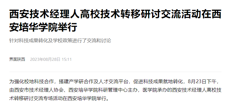为强化校地科技合作,搭建产学研合作及人才交流平台,促进科技成果就地转化,8月23日下午,由西安市技术经理人协会、西安培华学院科研管理中心主办,医学院承办的西安技术经理人高校技术转移研讨交流专场活动在西安培华学院举行。