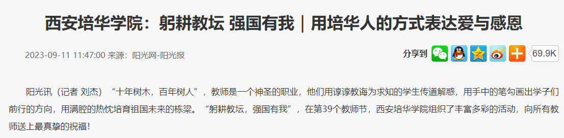 阳光讯(记者 刘杰)“十年树木,百年树人”,教师是一个神圣的职业,他们用谆谆教诲为求知的学生传道解惑,用手中的笔勾画出学子们前行的方向,用满腔的热忱培育祖国未来的栋梁。“躬耕教坛,强国有我”,在第39个教师节,西安培华学院组织了丰富多彩的活动,向所有教师送上最真挚的祝福!