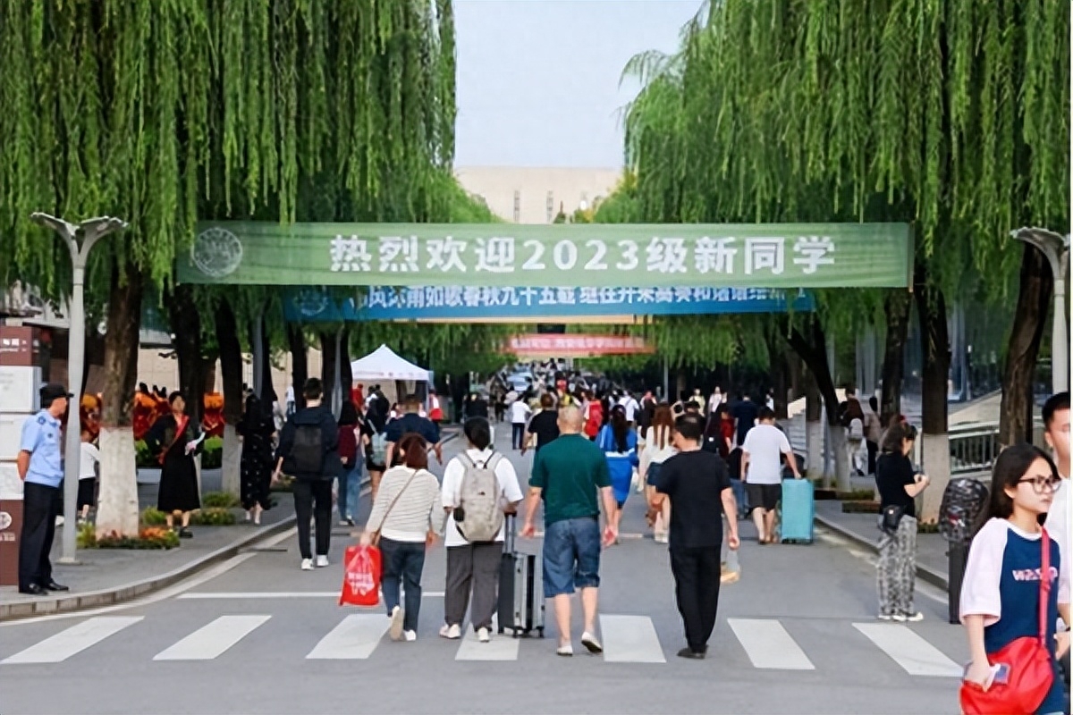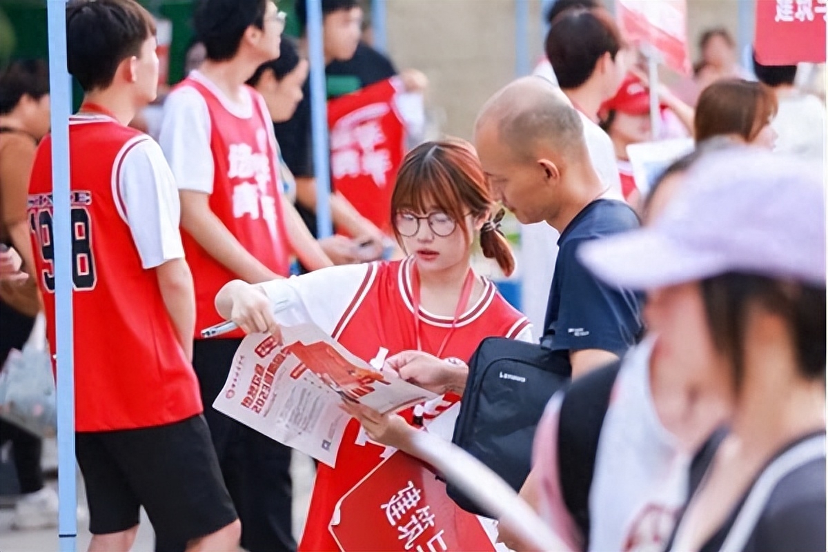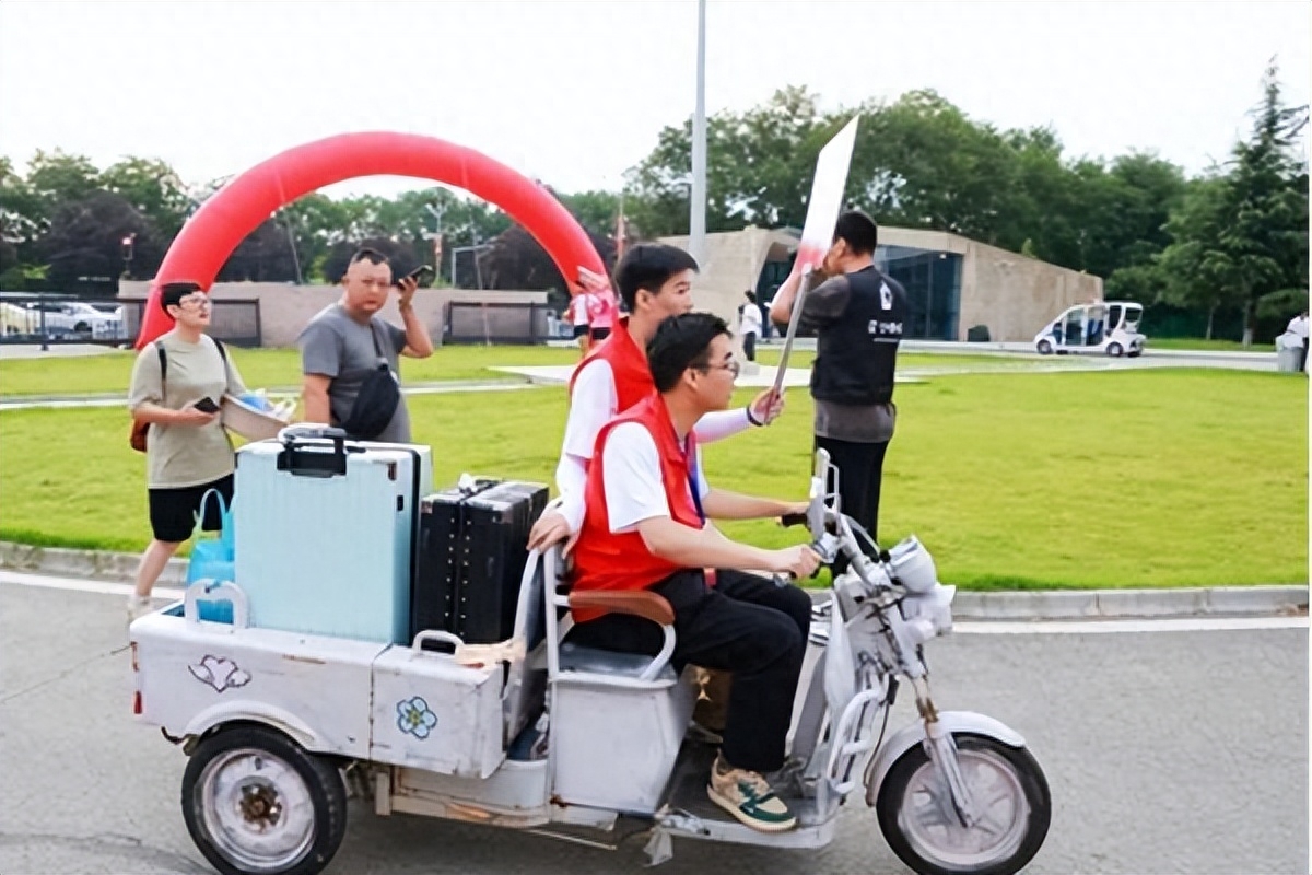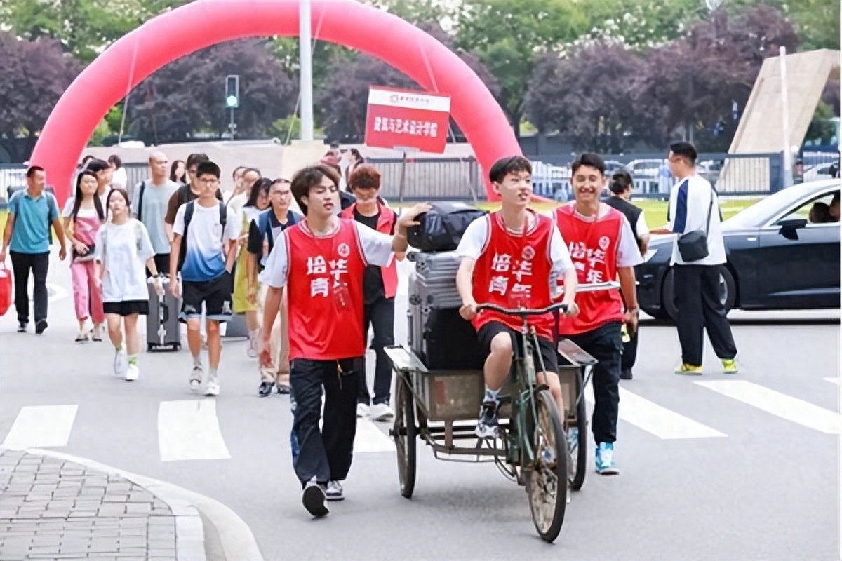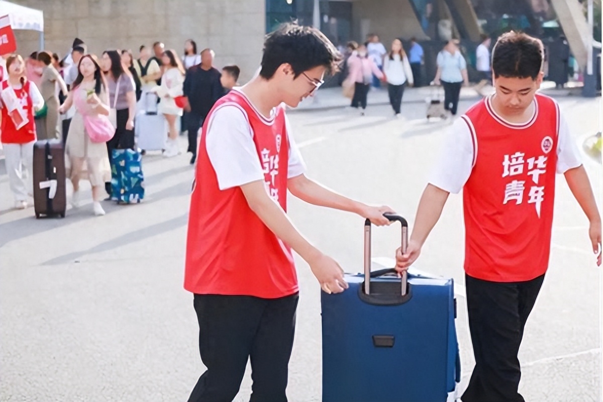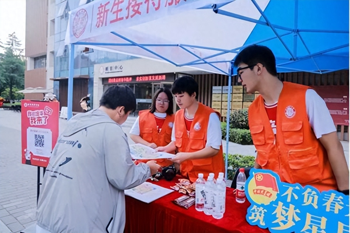 红马甲、小推车、迎新牌……志愿者的身影忙碌穿梭在校园各个地方,全校上下齐动员,热情周到地迎接新同学的到来。