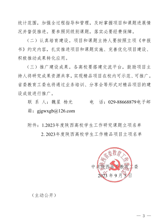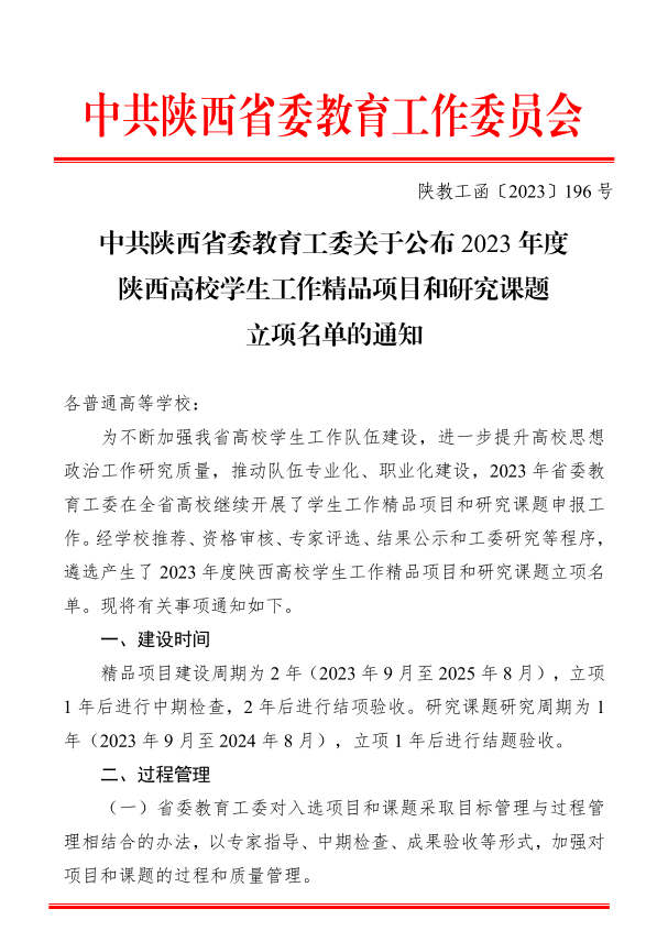 9月5日,中共陕西省委教育工委发布了《关于公布2023年度陕西高校学生工作精品项目和研究课题立项名单的通知》,学校党委学工部副部长权勇太主持的《以姜维之班创建提升立德树人育人成效的实践与探索》获精品项目立项;学生潜能发展中心叶腾老师主持的《“屏媒时代”大学生短视频成瘾现状及教育管理对策分析》获学生工作研究课题立项;人文与国际教育学院党委书记兼副院长南兵主持的《民办高校开展全程化精准化就业指导服务的路径研究》获学生工作研究课题立项。