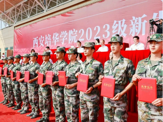 校领导为2023级新生军事国防教育先进集体、个人以及内务整理优秀宿舍代表颁奖
