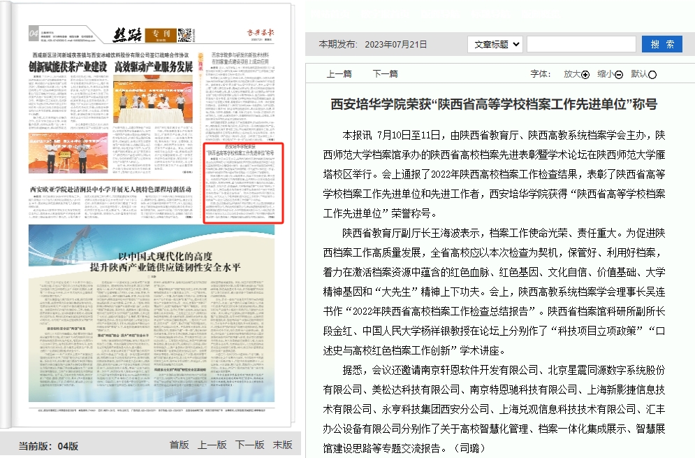 本报讯 7月10日至11日,由陕西省教育厅、陕西高教系统档案学会主办,陕西师范大学档案馆承办的陕西省高校档案先进表彰暨学术论坛在陕西师范大学雁塔校区举行。会上通报了2022年陕西高校档案工作检查结果,表彰了陕西省高等学校档案工作先进单位和先进工作者,西安培华学院获得“陕西省高等学校档案工作先进单位”荣誉称号。