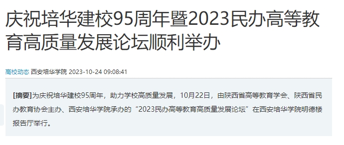 为庆祝培华建校95周年,助力学校高质量发展,10月22日,由陕西省高等教育学会、陕西省民办教育协会主办、西安培华学院承办的“2023民办高等教育高质量发展论坛”在西安培华学院明德楼报告厅举行。高等教育专家学者、民办高校负责人、行业企业专家等齐聚一堂,通过线下论坛交流、线上直播互动的方式,分享办学经验、探讨发展路径,研讨民办高校高质量发展的策略。本次论坛以“民办高等教育高质量发展”为主题,深入探讨民办高等教育如何在教育强国进程中发挥更大作用,更好地在应对发展挑战、破解时代性课题、服务区域创新发展、实现高质量发展等方面如何发挥高等教育不可替代的积极作用具有重要意义。