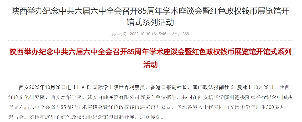 西安2023年10月28日电【I.A.E.国际学士院世界观察员、香港日报副社长、澳门政法报副社长 夏冰】10月28日,陕西红色文化研究院、西安培华学院、延安百融展览有限公司等多个单位携手,共同在西安培华学院明德楼隆重举行纪念中国共产党六届六中全会召开85周年学术座谈会暨红色政权钱币展览馆开幕式,多地各界人士代表同西安培华学院师生300多人一起与会。落地在这里的红色政权钱币纪念馆即日起开展,迎众参观。