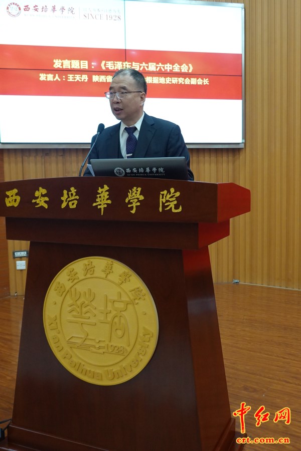陕西省陕甘宁革命根据地史研究会副会长王天丹研究员在纪念中共六届六中全会召开85周年座谈会上作题为《毛泽东与六届六中全会》的研究报告。 夏冰 摄