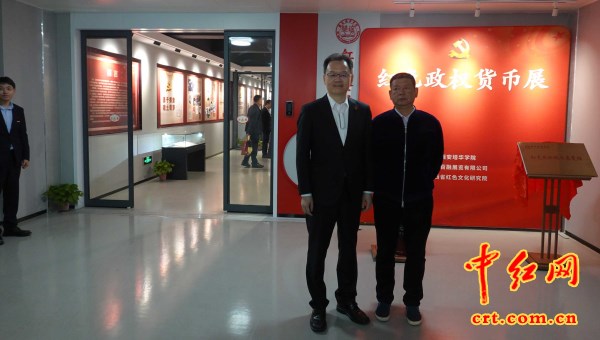 学习参观者中亚和平统一促进会会长张璠(右)与陕西省红色文化研究会理事长姜波博士在位于西安培华学院的红色政权钱币展览馆前合照纪念。 夏冰 摄