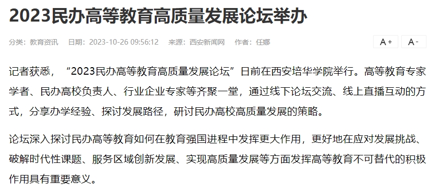 记者获悉,“2023民办高等教育高质量发展论坛”日前在西安培华学院举行。高等教育专家学者、民办高校负责人、行业企业专家等齐聚一堂,通过线下论坛交流、线上直播互动的方式,分享办学经验、探讨发展路径,研讨民办高校高质量发展的策略。