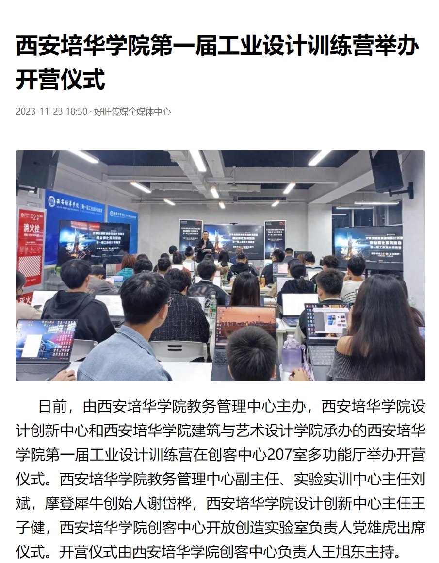 本次以“艺工融合”为主题的第一届工业设计训练营于近日启动,属于西安培华学院2023年度创新创业训练计划项目精益孵化系列活动的核心板块,由20余项培训内容组成,将一直延续至年底。本次训练营致力于为学生提供实际操作和积累经验的机会以提高他们的设计技能和创造力,通过这种实践性的学习,与工程、材料科学、市场营销等领域进行协同工作,创造出新的产品、服务或解决方案,这将有助于培养大学生的创新思维和解决问题的综合能力。