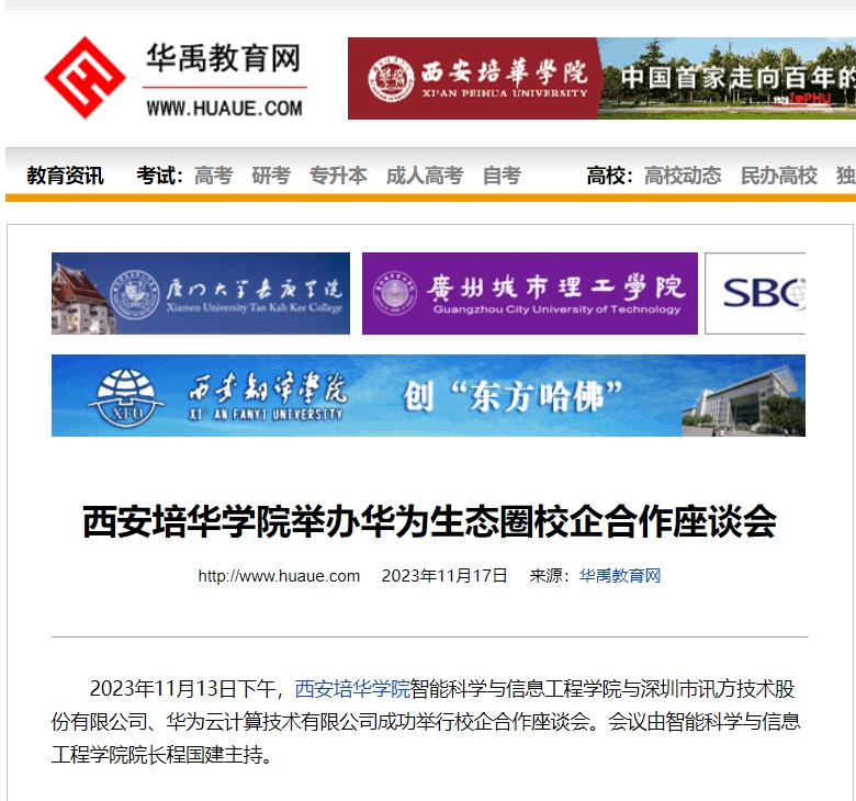 2023年11月13日下午,西安培华学院智能科学与信息工程学院与深圳市讯方技术股份有限公司、华为云计算技术有限公司成功举行校企合作座谈会。会议由智能科学与信息工程学院院长程国建主持。