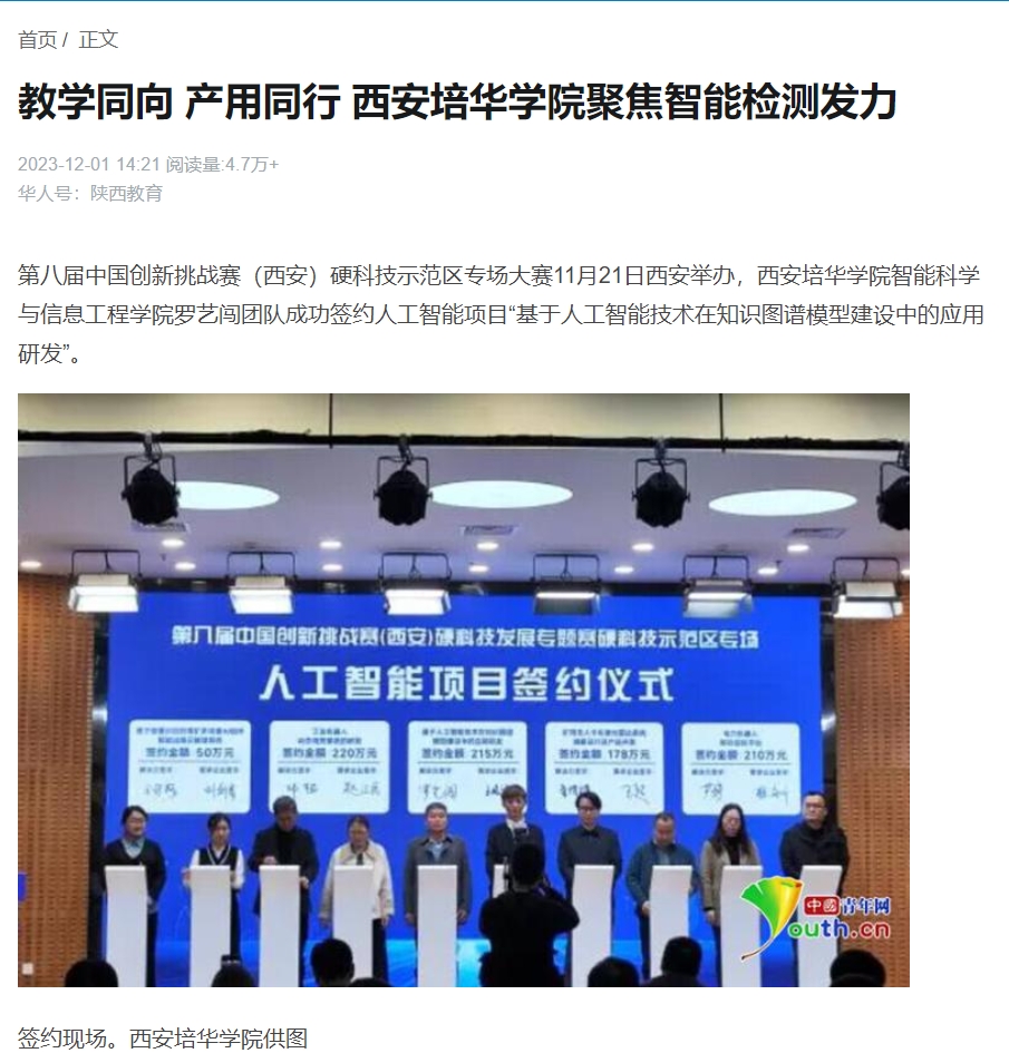来自西安培华学院智能科学与信息工程学院“智能检测技术联合研究中心”的罗艺闯团队经过激烈竞争,所出的技术方案最终获得企业方的认可,成功签约人工智能项目“基于人工智能技术在知识图谱模型建设中的应用研发”。