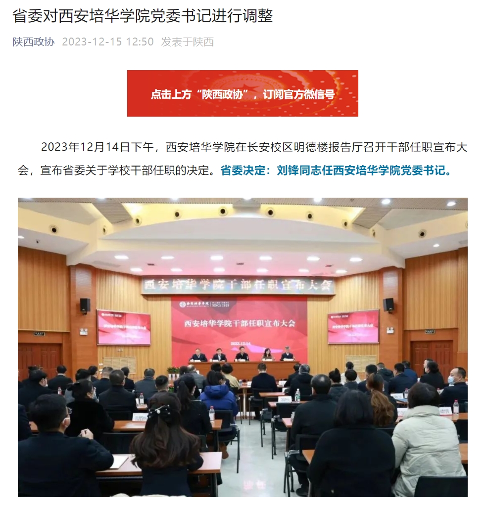 2023年12月14日下午,西安培华学院在长安校区明德楼报告厅召开干部任职宣布大会,宣布省委关于学校干部任职的决定。省委决定:刘锋同志任西安培华学院党委书记。