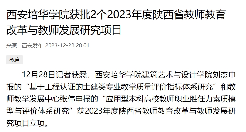 12月28日记者获悉,西安培华学院建筑艺术与设计学院刘杰申报的“基于工程认证的土建类专业教学质量评价指标体系研究”和教师教学发展中心张伟申报的“应用型本科高校教师职业胜任力素质模型与评价体系研究”获2023年度陕西省教师教育改革与教师发展研究项目立项。