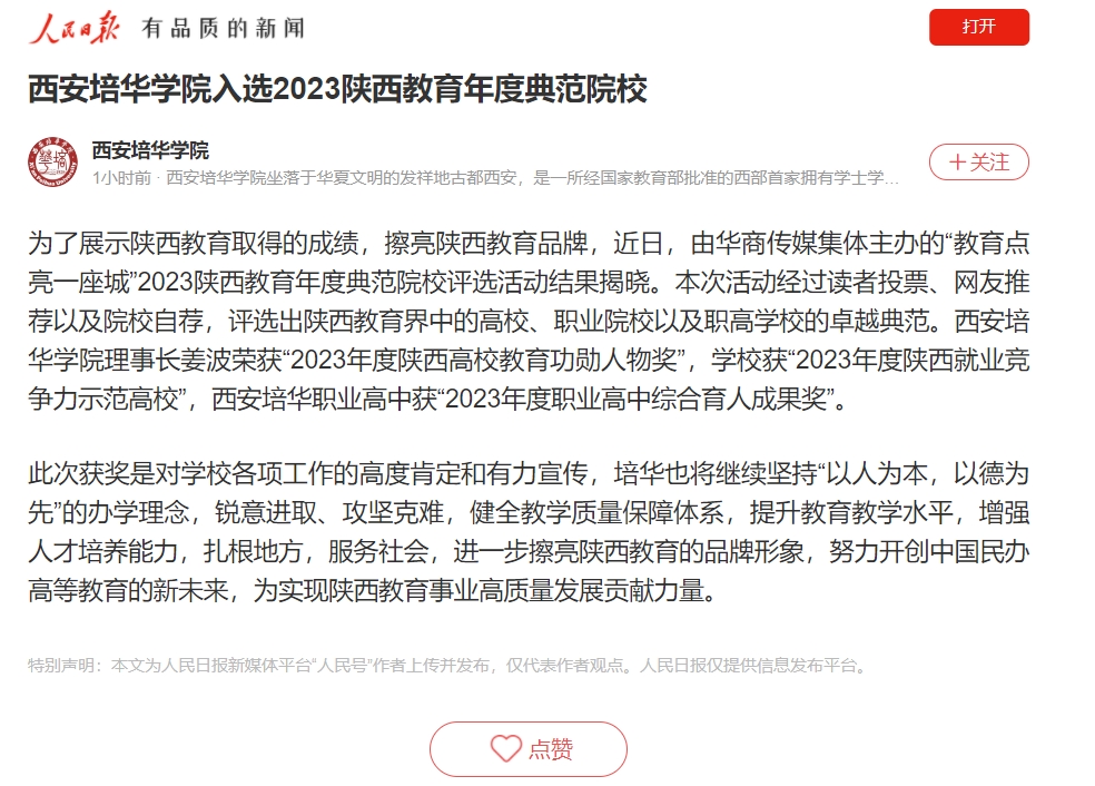 为了展示陕西教育取得的成绩,擦亮陕西教育品牌,近日,由华商传媒集体主办的“教育点亮一座城”2023陕西教育年度典范院校评选活动结果揭晓。本次活动经过读者投票、网友推荐以及院校自荐,评选出陕西教育界中的高校、职业院校以及职高学校的卓越典范。西安培华学院理事长姜波荣获“2023年度陕西高校教育功勋人物奖”,学校获“2023年度陕西就业竞争力示范高校”,西安培华职业高中获“2023年度职业高中综合育人成果奖”。
