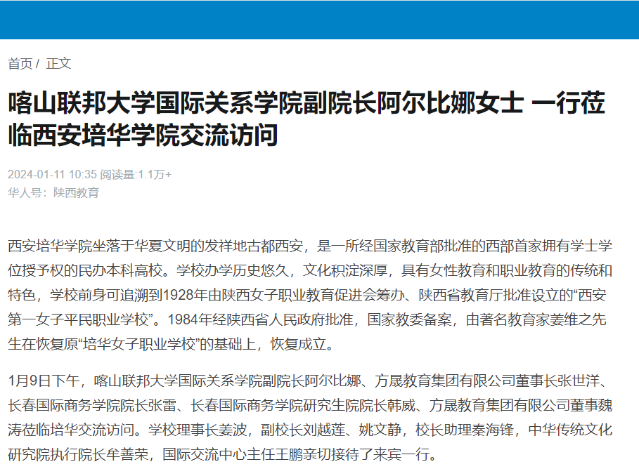 1月9日下午,喀山联邦大学国际关系学院副院长阿尔比娜、方晟教育集团有限公司董事长张世洋、长春国际商务学院院长张雷、长春国际商务学院研究生院院长韩威、方晟教育集团有限公司董事魏涛莅临培华交流访问。学校理事长姜波,副校长刘越莲、姚文静,校长助理秦海锋,中华传统文化研究院执行院长牟善荣,国际交流中心主任王鹏亲切接待了来宾一行。