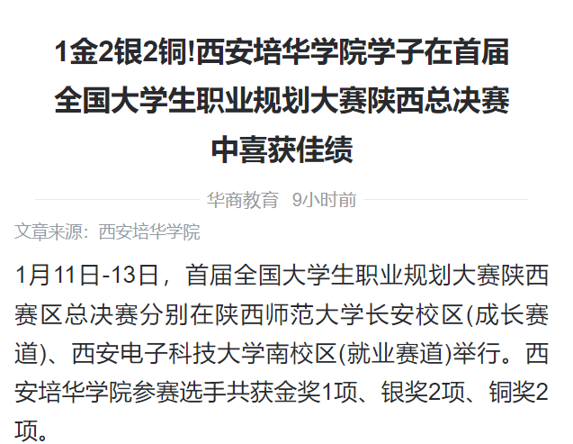 1月11日-13日,首届全国大学生职业规划大赛陕西赛区总决赛分别在陕西师范大学长安校区(成长赛道)、西安电子科技大学南校区(就业赛道)举行。学校参赛选手共获金奖1项、银奖2项、铜奖2项。