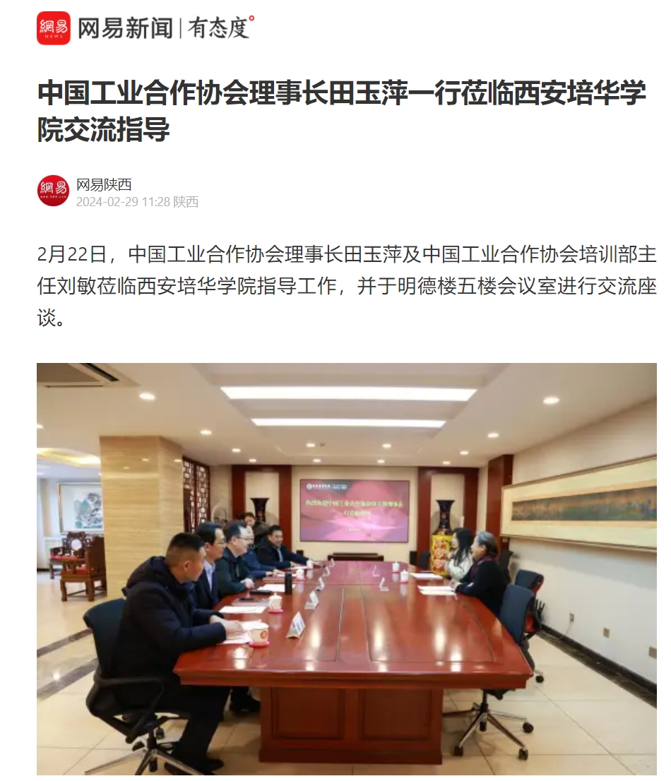 2月22日,中国工业合作协会理事长田玉萍及中国工业合作协会培训部主任刘敏莅临西安培华学院指导工作,并在该校明德楼五楼会议室进行交流座谈。