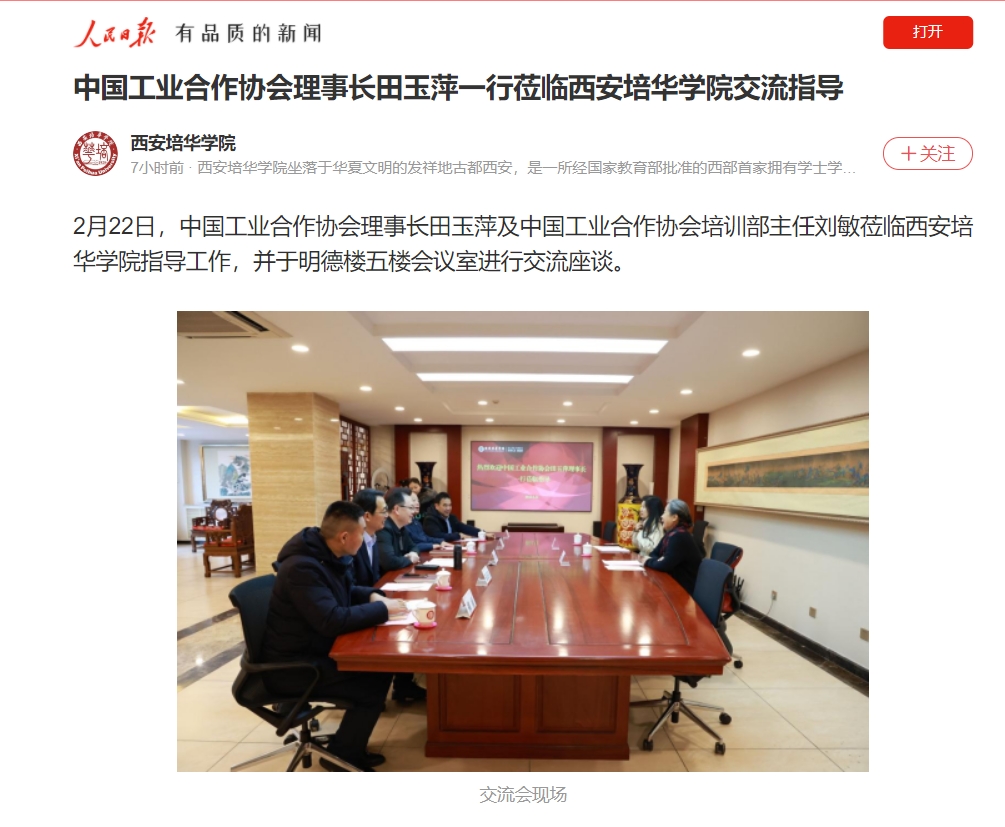 2月22日,中国工业合作协会理事长田玉萍及中国工业合作协会培训部主任刘敏莅临西安培华学院指导工作,并在该校明德楼五楼会议室进行交流座谈。