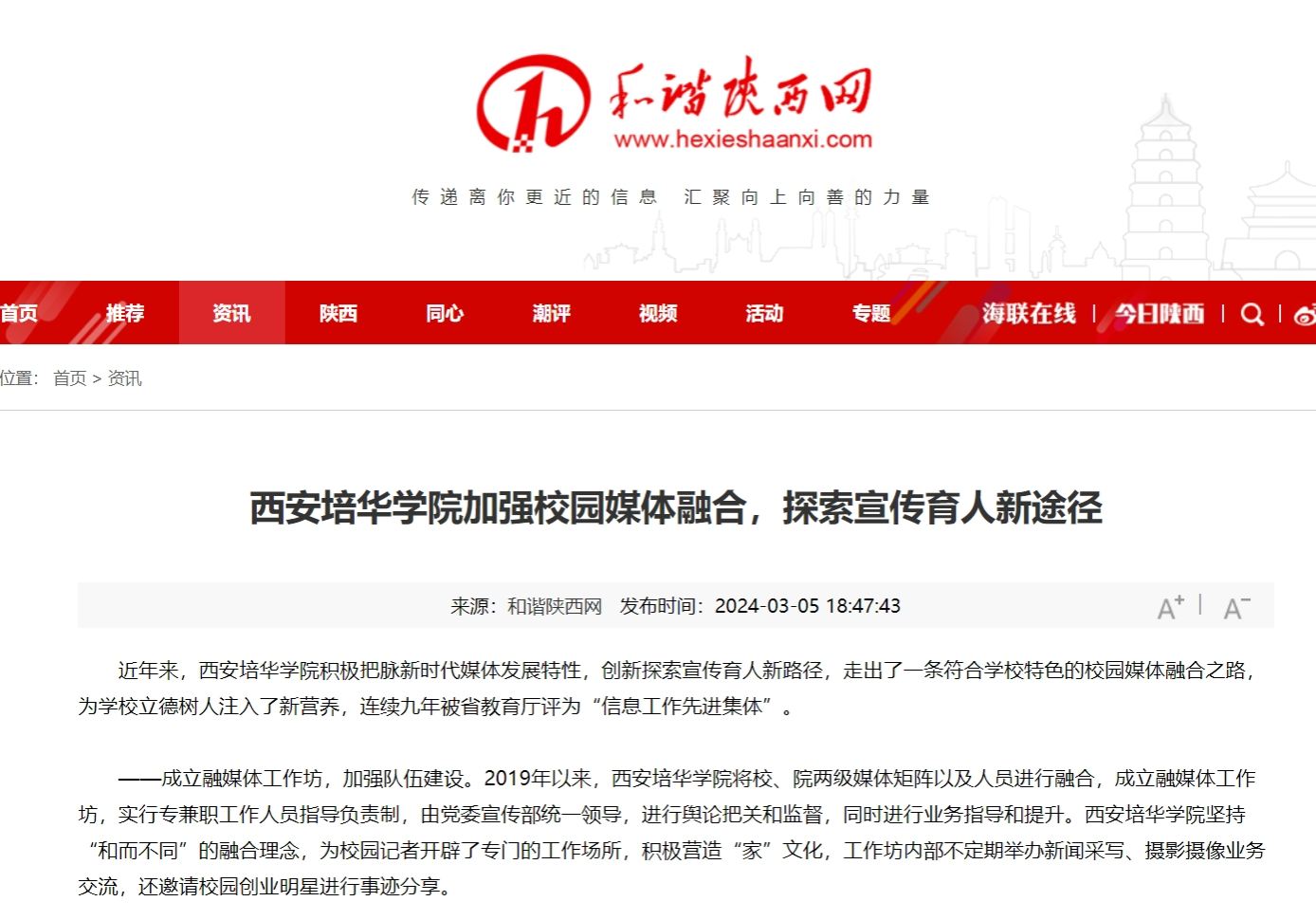 近年来,西安培华学院积极把脉新时代媒体发展特性,创新探索宣传育人新路径,走出了一条符合学校特色的校园媒体融合之路,为学校立德树人注入了新营养,连续九年被省教育厅评为“信息工作先进集体”。