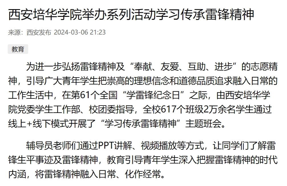 为进一步弘扬雷锋精神及“奉献、友爱、互助、进步”的志愿精神,引导广大青年学生把崇高的理想信念和道德品质追求融入日常的工作生活中,在第61个全国“学雷锋纪念日”之际,由西安培华学院党委学生工作部、校团委指导,全校617个班级2万余名学生通过线上+线下模式开展了“学习传承雷锋精神”主题班会。