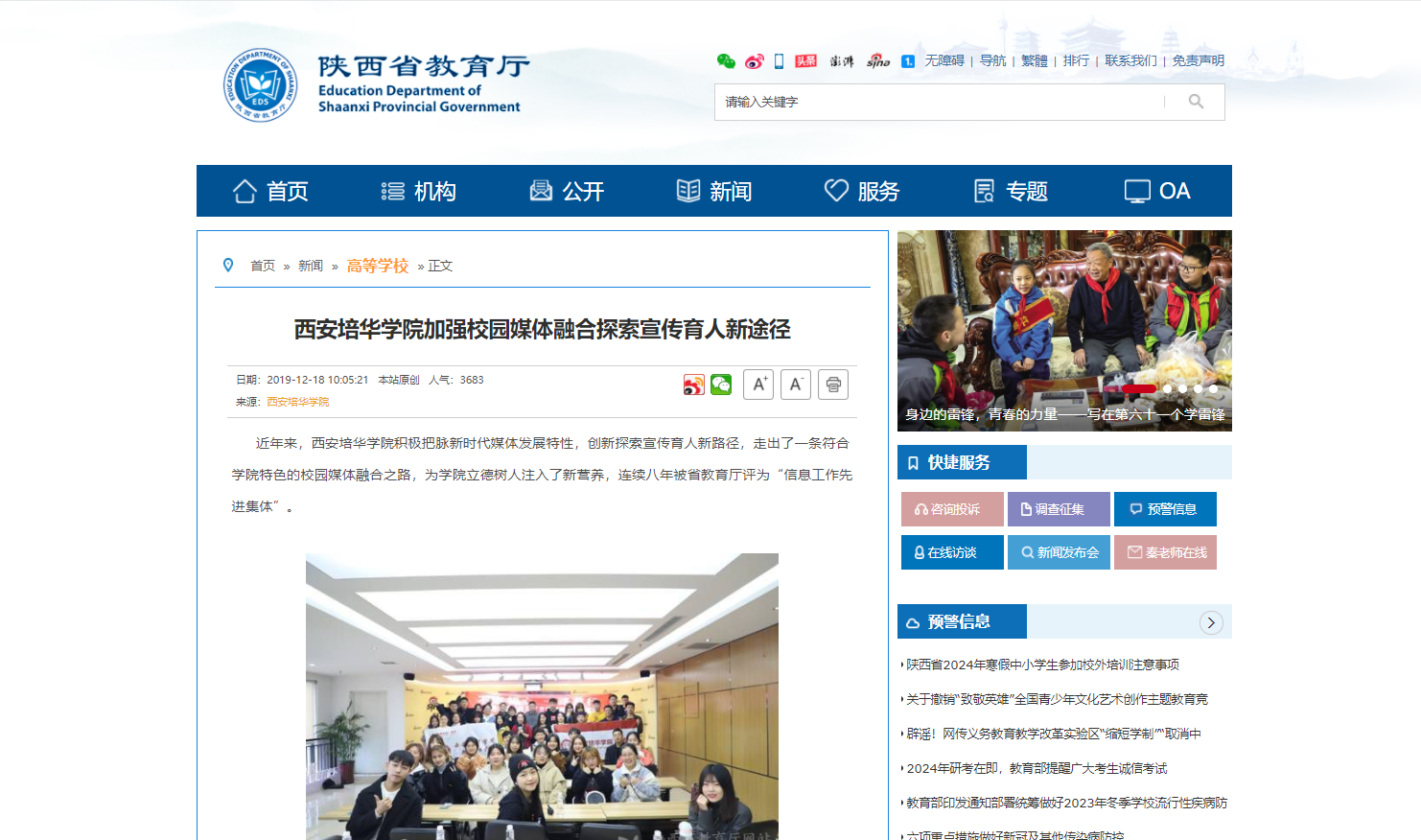 近年来,西安培华学院积极把脉新时代媒体发展特性,创新探索宣传育人新路径,走出了一条符合学校特色的校园媒体融合之路,为学校立德树人注入了新营养,连续九年被省教育厅评为“信息工作先进集体”。