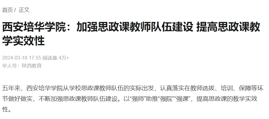 五年来,西安培华学院从学校思政课教师队伍的实际出发,认真落实在教师选拔、培训、保障等环节做好做实,不断加强思政课教师队伍建设。以“强师”助推“强院”“强课”,提高思政课的教学实效性。