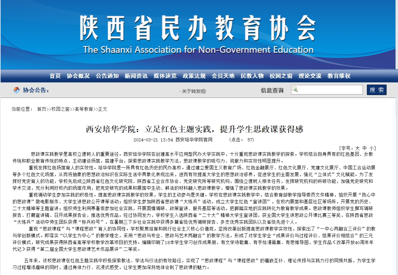 思政课实践教学是高校立德树人的重要途径。西安培华学院在创建高水平应用型民办大学实践中,十分重视思政课实践教学的探索。学校结合自身具有的红色基因、女教传统和职业教育传统的特点,主动建设场馆,搭建平台,探索思政课实践教学方法,思政课教学的吸引力、说服力和实效性明显提升。