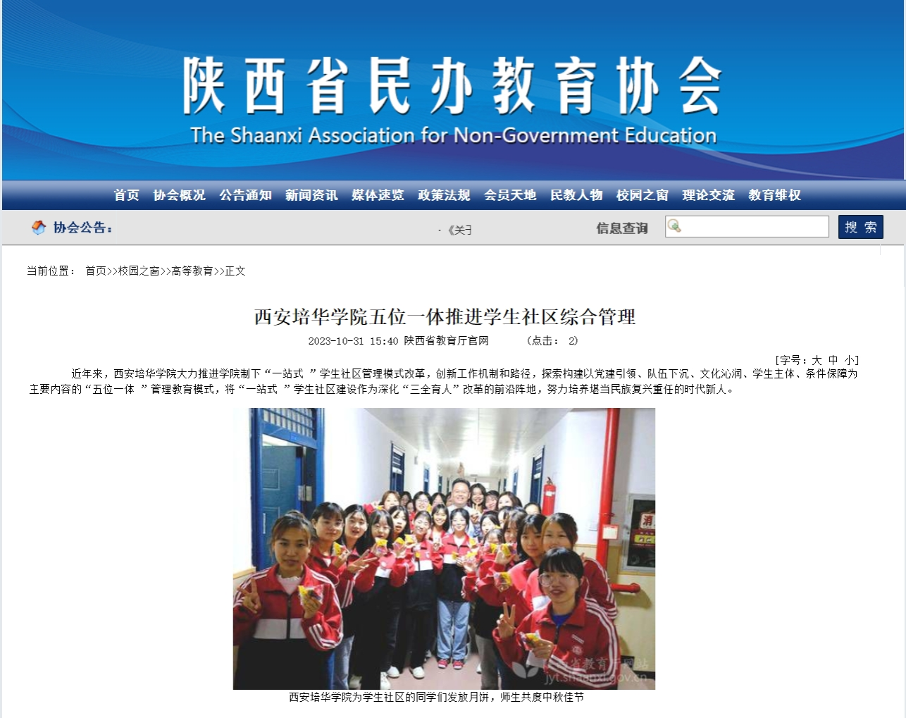 近年来,西安培华学院大力推进学院制下“一站式 ”学生社区管理模式改革,创新工作机制和路径,探索构建以党建引领、队伍下沉、文化沁润、学生主体、条件保障为主要内容的“五位一体 ”管理教育模式,将“一站式 ”学生社区建设作为深化“三全育人”改革的前沿阵地,努力培养堪当民族复兴重任的时代新人。