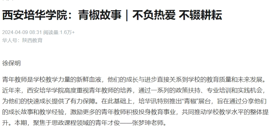青年教师是学校教学力量的新鲜血液,他们的成长与进步直接关系到学校的教育质量和未来发展。近年来,西安培华学院高度重视青年教师的培养,通过一系列的政策扶持、专业培训和实践机会,为他们的快速成长提供了有力保障。在此基础上,培华讯特别推出“青椒”展台,旨在通过分享他们的成长故事和教学经验,激励更多的青年教师积极投身教育事业,共同推动学校教学水平的整体提升。本期,聚焦于思政课程领域的青年才俊——张梦珅老师。