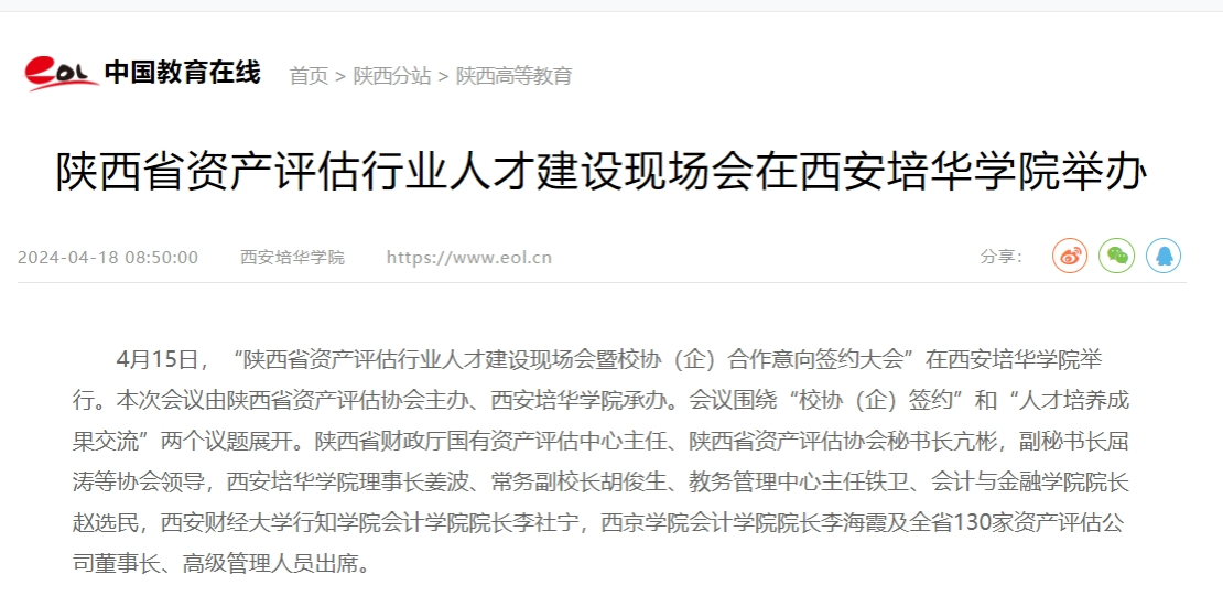 会上,陕西省资产评估协会分别与西安培华学院、陕西财经大学行知学院、西京学院签订了人才建设合作意向书;西安培华学院与正衡、新兰特、天健兴业、中和、金达、卓信大华、同道、旭隆、信通、天任十家资产评估公司签订了联培协议。