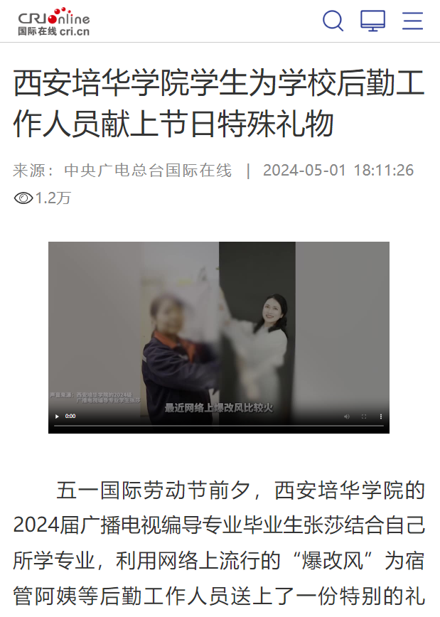五一国际劳动节前夕,西安培华学院的2024届广播电视编导专业毕业生张莎结合自己所学专业,利用网络上流行的“爆改风”为宿管阿姨等后勤工作人员送上了一份特别的礼物。几位同学对学校的宿管阿姨、保安师傅、后勤维修工等共13名劳动者进行“爆改”,通过帮他们化妆、拍摄写真照的方式,为他们记录下美好瞬间,感谢他们对师生校园生活保障的付出。