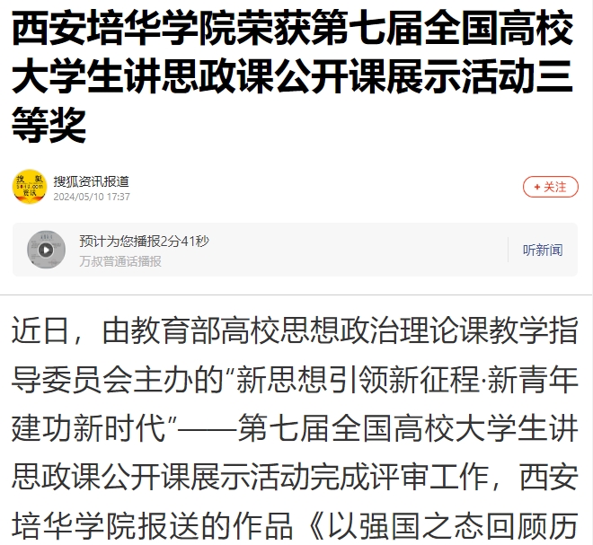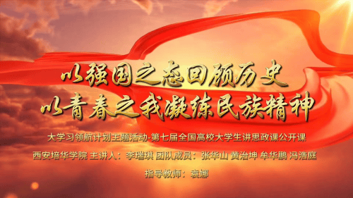 近日,由教育部高校思想政治理论课教学指导委员会主办的“新思想引领新征程·新青年建功新时代”——第七届全国高校大学生讲思政课公开课展示活动完成评审工作,西安培华学院报送的作品《以强国之态回顾历史,以青春之我凝练民族精神》获得全国本科组三等奖,这是西安培华学院第一次获得此奖项,标志着学校思政教育教学改革在创新实践方面取得了重要突破,彰显了培华学子在深入挖掘历史内涵、传承民族精神方面的责任担当。